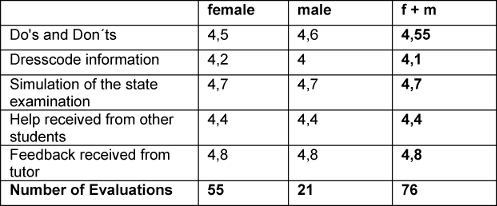 The evaluation stated the following: The lists with “Do´s and Don’ts” were evaluated with an average value of 4,55 to be very helpful. Likewise, the information about the dress code was helpful with a mean of 4,1. The simulation of the state examination scored an average value of 4,7, the help received from other students scored 4,4 and feedback received from the tutor 4,8 (see Table 1 [Tab. 1]).