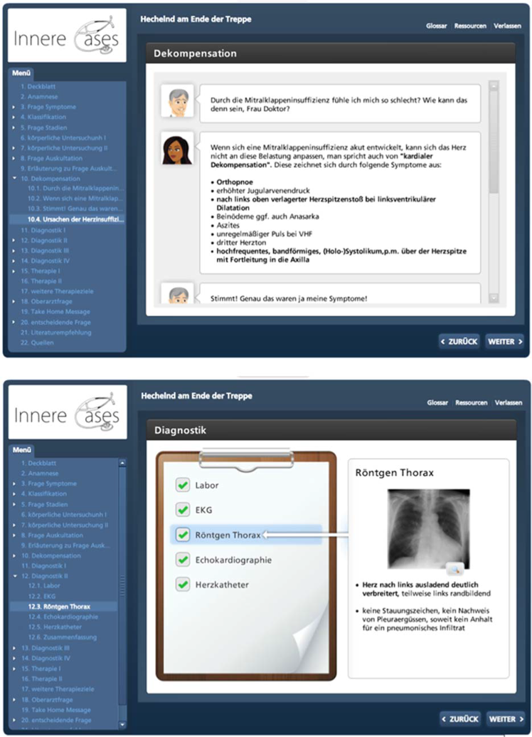 So as to achieve an improvement in the BSC, the course content was revised and global as well as specific learning objectives were defined. In order to cater for the wishes and suggestions for improvements of the students and lecturers involved, resulting from the evaluations of this course as well as the feedback from students in other studies on the optimisation of practical courses [14], structured improvement measures were integrated in the course structure (see Figure 1 [Fig. 1]). This led to the introduction of scripts in WS 13/14. The scripts contained medical history sheets as well as instructions on how to carry out patient interviews. Structured instructions and tips were also provided on different internal medicine examinations, e.g. a thorax examination. Apart from the physiological findings, pathologies were also often explained along with their clinical evaluation. A targeted preparation for and follow-up to the course by the students was possible thanks to the prior division over the various internal medicine wards and the associated specialist fields. The lecturers were also able to prepare for the individual days of the course with the help of the scripts. In addition to these scripts, a lecturer briefing was held in the morning meetings in each of the hospitals during which all of the lecturers were instructed in the content of the course on the basis of the scripts and the desired evaluation by the students, and during which the importance of supervising the students during history-taking and the physical examination was stressed. Furthermore, a contact person was appointed for the courses whose work included regular reminders of the course and who also helped supervise these. E-learning cases were introduced simultaneously in the winter semester 2013/14. The lecturers were instructed to recommend these to the students as a voluntary form of preparation for and follow-up to the course. These were patient cases that had been created with the program Articulate®, an e-learning software. These cases were taken from the internal medicine disciplines of cardiology, pneumology, gastroenterology, haematology, oncology as well as nephrology and endocrinology. These could be accessed via the Moodle platform of the Technical University Munich, which is open to all students of the TU, after they had registered for the course. The 14 cases constituted an interactive elaboration of a clinical picture on the basis of a concrete patient with his medical history. A quiz in the form of multiple choice questions was linked to information about the respective illness and the associated diagnostic testing and therapy (see Figure 2 [Fig. 2] and Figure 3 [Fig. 3]).