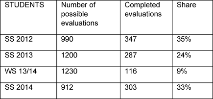 After the students had been rotated between the individual courses and were therefore taught by different lecturers, the lecturers can only assess the students' momentary status of knowledge and ability, but not their actual individual development or changes in this. Together with the lack of an objective measure of performance, e.g. in the form of an OSCE, can make it more difficult to evaluate the students throughout the course or semester. Moreover, most of the students and lecturers did not report back, so that a representative evaluation is difficult. Because of the anonymous character of the questionnaire, it is impossible to make out whether predominantly high performing or weak students report back. Moreover, there are differences between the semesters with respect to the numbers of reports back for self- and external assessment. While in the winter semester 13/14, 9% of students reported back, the corresponding figure in the summer semester 12 was 35% for the quantitative questions. For lecturers too, the assessments varied from 25% in the summer semester 13 to 55% in summer semester 12. The differences in the numbers of reports back make it more difficult to compare the semesters directly. Another limiting point is the lack of missing data for winter semester 2012/2013; these could not be integrated in this study for technical reasons and which would have been helpful for a complete comparison between different periods.