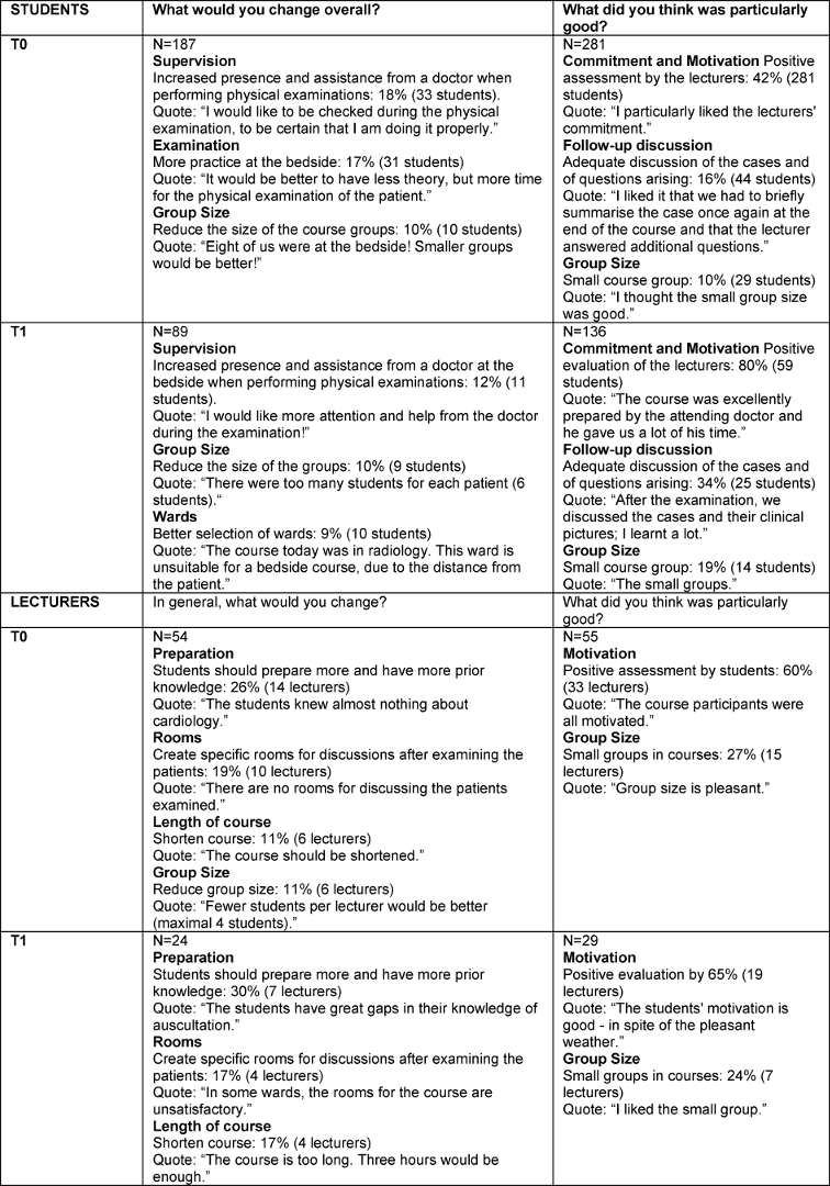 The students also had the possibility of providing feedback in the form of a free text answer to the questions "In general, what would you change?" and "What did you think was particularly good?". All free text answers to a question were screened and the tips, suggestions and comments that were provided were then classified in categories. The individual free text answers of the students and lecturers were then assigned to these categories separately for the periods before (T0) and after the introduction of the improvement measures (T1) and their frequency evaluated. The three most common answers in a period were worked out, provided these had been given by at least 10% of the respondents.