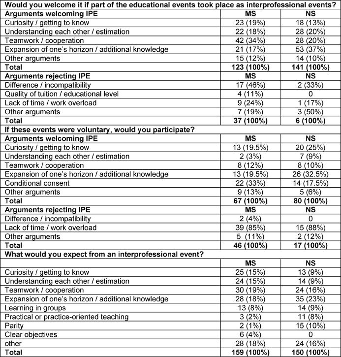 In both groups favorable arguments outweighed unfavorable ones. However, the weighting of favorable arguments varied strongly. In the category, "conditional approval", demands were made regarding didactics, parity of the occupational groups, as well as a clear definition of the objectives of IPE. The highest number of negative arguments put forth in both groups concerned the question of participation in voluntary IPE events, but clearly more so in the MS group. The main negative argument given by both groups was lack of time/work overload. Additionally, the MS made a point of the difference in demands on knowledge and quality level.