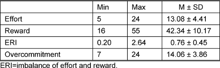Table 3 [Tab. 3] shows the results for effort, reward, and overcommitment. There were no gender differences for any of these scales. The results on the reward scale were on average higher than the results on the effort scale (after adjusting for the different number of items on the two scales). The ERI coefficient had a mean (SD) of 0.76 (0.45) and a range of 0.20 to 2.64. Participants of the survey with an ERI significantly below 1 were in a range that indicated a shift of the balance in favor of reward.