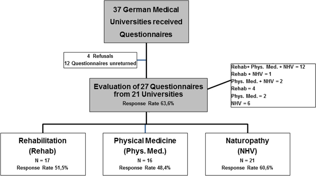 The development of the questionnaire was based on preliminary surveys from 2006 and 2009, on our own professional experiences as well as a through a literature search. The proposed list of questions was presented and discussed at a working group meeting held in Berlin in January 2014. We invited all individuals responsible for dealing with the research and teaching of NHV and CAM from the working groups of all German Medical Universities. Moreover this questionnaire was sent to the German Society of Rehabilitation Sciences (DGRW) as well as to the German Society of Physical Medicine and Rehabilitation (DGPMR). They were asked to comment on the questionnaire or give suggestions of improvements and support the survey by sending the questionnaire to their contacts.