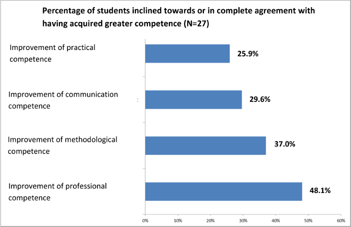 With the BevaKomp instrument [13] the students were asked to name the areas in which they subjectively experienced enhanced competence as a result of taking part in the seminars. The number of students inclined towards or in complete agreement with the items after taking part one year in the model project versus those inclined towards or completely rejecting the items was determined. 48.1% of the students were inclined towards or in complete agreement that the KAM seminars enhanced their professional competence. More than one third of the participants (37%) subjectively experienced an improvement in methodological competence. 26% and 30% reported improvement in practical and communication competence (see Figure 1 [Fig. 1]).
