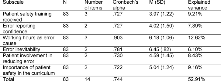 In the original scale’s criterion validation, seven subscales could differentiate between novice students and experienced tutors. The scales are reliable, with a Cronbach’s alpha of .63 to .82. The 26 items are distributed among 9 subscales with 2 to 4 items each. They comprise questions requiring responses from “strongly agree” to “strongly disagree”. The following is an example from the subscale Error Reporting Confidence: “I would feel comfortable reporting any errors I had made, no matter how serious the outcome had been for the patient.” [12].