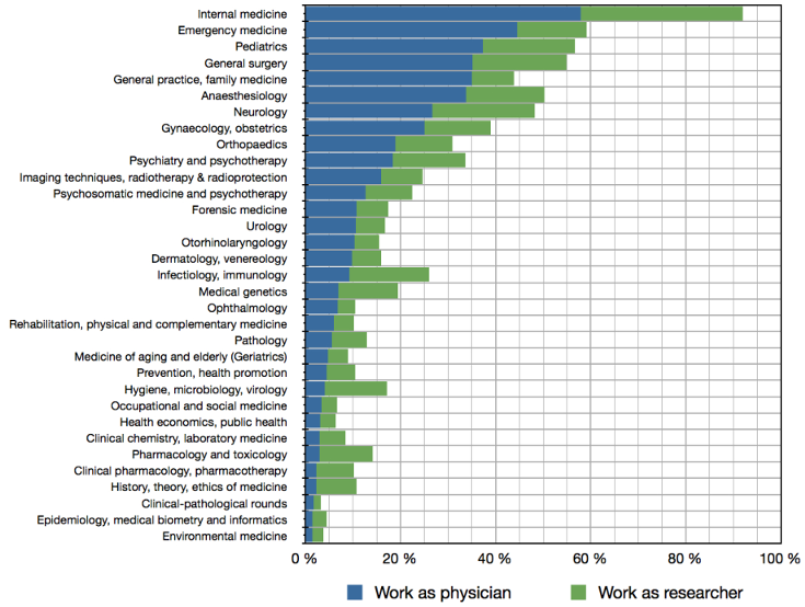 Figure 5: Answers to the questions whether students could imagine a particular discipline for future medical practice (blue) or research (green). Multiple choices were possible.