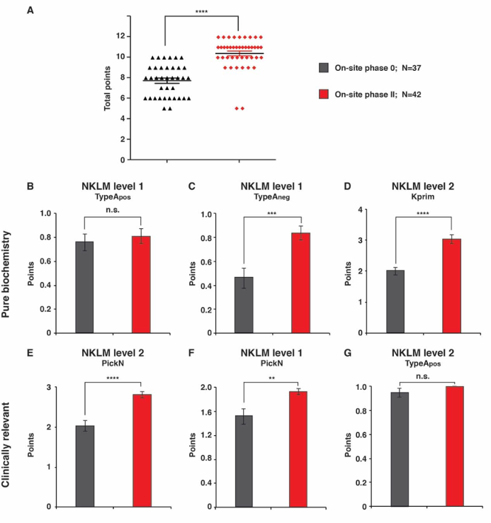 Figure 3: Results of the knowledge test A. Results of the knowledge test held with the IC groups in the on-site phases 0 and II. The maximum number of points that could be achieved was 12. 37 students took part in the knowledge test in on-site phase 0 and 42 in on-site phase II. B-G. Classification of the questions from the knowledge test as purely biochemistry questions (B-D) and questions with a clinical relevance (E-G). Competency level 1 (factual knowledge) and 2 (reasoning knowledge and know-how) according to the NKLM as well as the types of questions are also shown. The Y-axis shows the maximum possible number of points for each questions. p-value, ** p=0.01; *** p=0.001; **** p=0.0001; n.s., not significant.