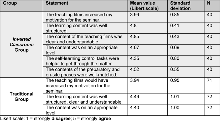 To allow a comparison of the two teaching concepts employed, all students were given the chance to evaluate the seminar electronically after the course with the help of the official evaluation sheet of the Medical Faculty in Ulm. Both groups received identical evaluation questions.