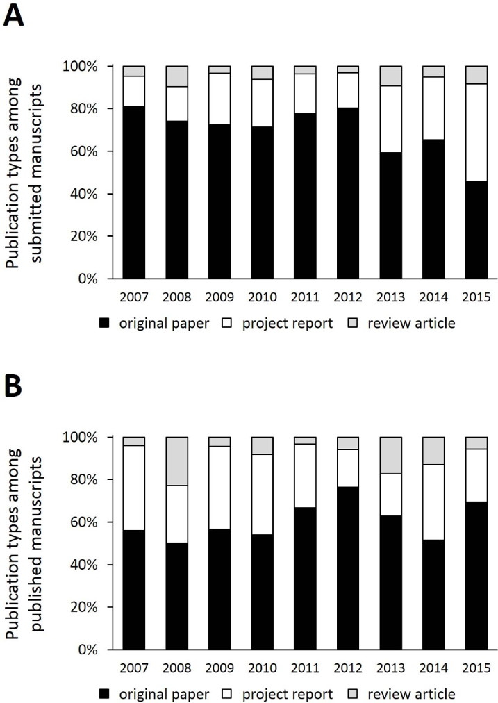 Figure 3: Publication types (original paper, project report, review article) in manuscripts submitted to (A) or published in (B) GMS Z Med Ausbild from 2007 to 2015.