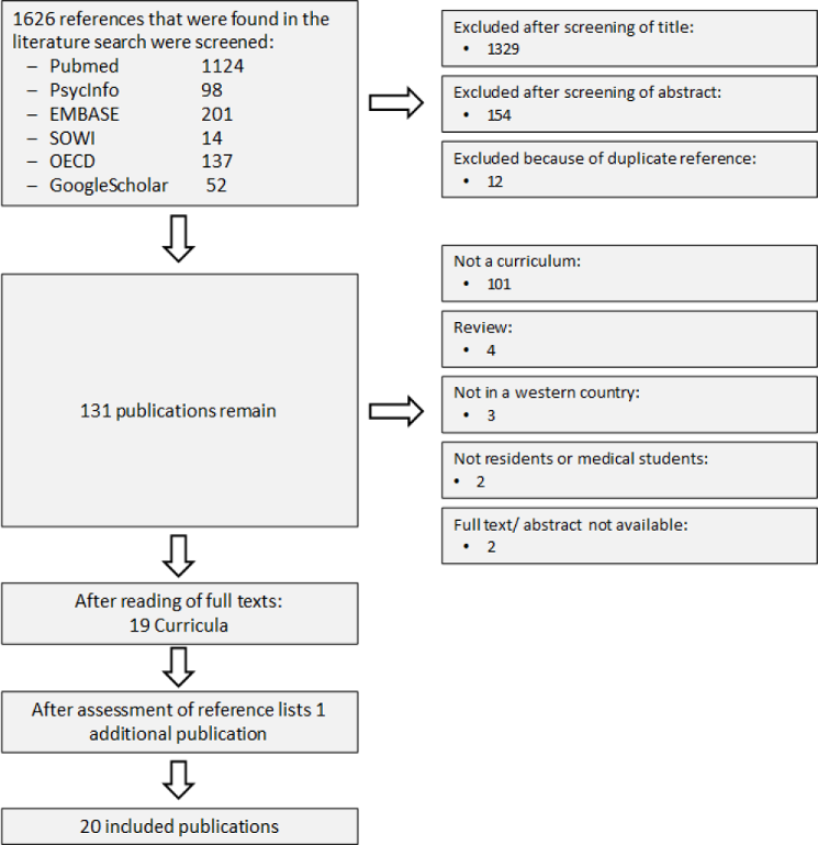 The primary literature search yielded 1,626 references. After screening of title, abstract and full text, 19 publications fulfilled the inclusion criteria. Figure 1 [Fig. 1] gives an overview of the reasons for exclusion. Two publications from Pakistan and one from Nepal were excluded from analysis because we assumed that the context of the health care system and the medical school curriculum are not comparable with those of western countries [14], [15], [16].