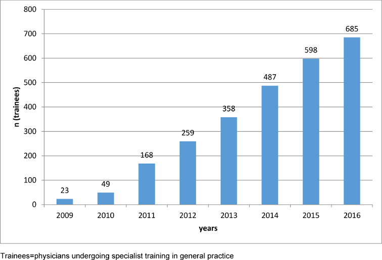 In face of the looming shortage of general practitioners in Germany primary care provided by general practitioners and, as a result, medical education and post-licensure specialization in general practice have increasingly become a part of the political agenda. While searching for the root causes of this shortage of general practitioners, structural weaknesses in post-graduate education, such as the absence of a curriculum for physicians undergoing post-graduate training, were found and criticized. The unattractiveness of general practice in comparison to other medical specialties was also identified as a reason [1], [2]. Analysis of the German Medical Association (Bundesärztekammer) in 2015 shows that for the specialty medical exams taken (Facharztprüfung) there has been for years now a steady imbalance between medical specialists and general practitioners of 89.1% (n=10894) to 10.9% (n=1337) [3]. Despite the high number of medical specialists, there has been talk for some time now regarding a general shortage of doctors [4], and there have been discussions of increasing the quality of post-graduate medical education through structured specialized training in all subjects [5].