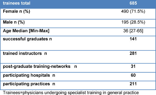 Results: Since starting in 2009, 685 physicians have entered the program and 141 have passed the examination to become medical specialists (as of December 2016). In total, 31 networks, 60 hospitals and 211 general practices have participated. The seminar sessions have been rated on average with 1.43 on a six-point Likert scale by the physician trainees (1=extremely satisfied, 6=extremely dissatisfied). Alongside the medical training, these physicians viewed the exchange of information and experiences with other physicians as very positive and important. In 185 seminars lasting 90 minutes each, the seminar program has presently covered 250 out of 320 units in the competency-based curriculum for general medicine. A total of 281 trainers have been trained in 13 train-the-trainer courses and have rated this course on average with 1.36 on a six-point Likert scale. Above all, the trainers emphasized the exchange of information and experiences with other trainers as very positive. In 2013 the DEGAM concept for its Verbundweiterbildungplus program was developed based on that of the VWBplus BW. Since 2008 over 40 articles on the topic of post-graduate medical education have been published.