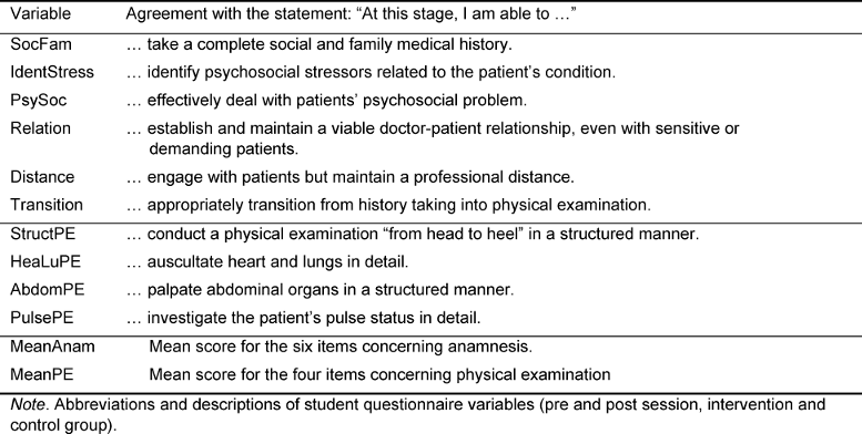We used quantitative questionnaire to assess students’ abilities. The students’ version had pre- and post-session-ratings, in which participants self-rated their perceived current skills in different aspects of physical examination as well as communication and interaction (4 and 6 items, respectively; see table 1 [Tab. 1] for a complete list) on six-level Likert scales ranging from 1=completely able to 6=complete unable. The preceptor rated students’ skills after their anamnesis and examination, respectively (altogether 20 items in an extended but comparable version of the students’ questionnaire). The control group questionnaire was identical to the participants’ pre-session version. Finally, we calculated scales for self-reported (anamnesis, physical examination) and preceptor-rated skills (anamnesis, patient interaction, physical examination).