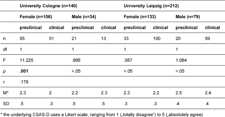 Additionally significant three-way interactions of the factors university, section of study and gender were found for both subscales PAS [F(1,344)=10.1, p=.002, r=.169] and NAS [F(1,344)=5.249, p=.023, r=.123]. Simple comparisons (see table 3 [Tab. 3]) show that female students in Cologne were the only participants whose PAS scores are significantly higher in the clinical courses (M=3.9; SD=.4) than in the preclinical courses (M=3.7; SD=.4). All other subgroups show converse results: Male students in Cologne as well as female and male students in Leipzig reported lower PAS scores in the clinical courses than in the preclinical section of study. There is a similar trend looking at the NAS scores (see table 4 [Tab. 4]): Female students in Cologne reported lower NAS scores in the clinical courses (M=2; SD=.3) than in the preclinical courses (M=2.3; SD=.5). There are no significant differences between preclinical and clinical section of study in the other subgroups.