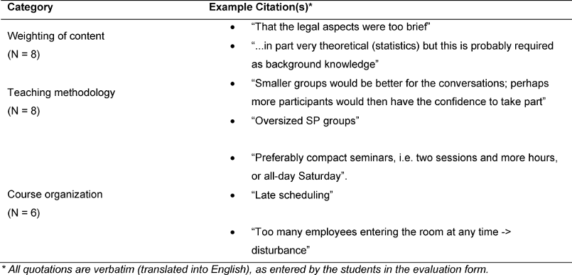 Negative aspects of the course (see Table 3 [Tab. 3]) were the weighting of the content elements, particularly the lack of time allocated to the partially complex legal aspects. Regarding teaching methods, the large size of the group (max. 12 participants) in discussions with SPs was a topic of criticism. The late scheduling of the course (4.30-6.45 p.m.) was an object of specific criticism regarding course organization.