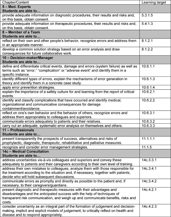 The course on risks and errors deals with topics of specific importance for the medical profession [8], [11], [12] – topics which, to the best of the authors’ knowledge, have so far scarcely been dealt with within the framework of medical studies. A comparative study of the Nationalen Kompetenzbasierten Lernzielkatalog Medizin/National Competence-Based Learning Objectives Catalogue for Medicine [http://www.nklm.de] (cf. Table 6 [Tab. 6]) and the position paper of the Committee for Patient Safety and Error Management of the Gesellschaft für Medizinische Ausbildung [13] – published after the course was designed – shows that the course accounts for such key learning objectives and competences as are set out in the documents mentioned above.