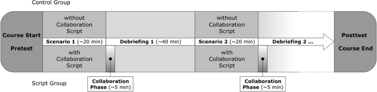 A patient simulator (Laerdal SimMan®) was embedded into a typical clinical setting with authentic, fully functional medical equipment and treated similar to an actual patient. At the beginning of each course, participants took a CRM pretest that asked them to rate their ability to apply CRM heuristics in an emergency situation. After that, the instructor informed the participants about the simulator and the procedures of the scenario and the debriefing. The simulation-based training consisted of seven or eight scenarios, each simulated emergency situations with durations of about 20 minutes, in which a team of four to five students handled an incident and rescued the patient. The remaining six to eight students in the course observed the actions taking place in the simulator from a room nearby via audio/video projection. At the beginning of each observational phase, learners received instructions according to the experimental conditions (two courses with collaboration scripts, two courses without). After completion of each scenario, a video-assisted debriefing of about 40 minutes took place in which the instructor together with the whole group analyzed and reflected on the simulated situation. In each scenario, a different team of students was working in the simulator, so that all course participants had encountered one or two hands-on experiences and numerous observations by the end of the training. Scenarios were not completely identical across the four courses, but they were all directed toward these aims: