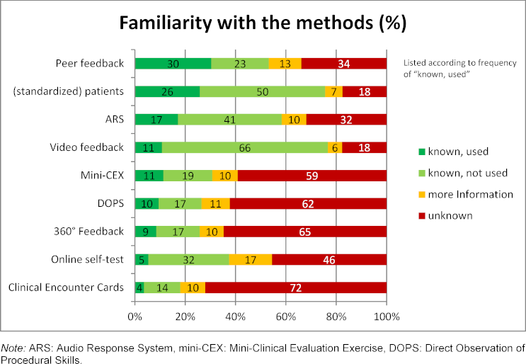 Several feedback methods are not known to the majority of the instructors. 360° feedback was unknown to 65% of those surveyed; this lack of familiarity is also very relevant for the checklists. CEC is unknown to 72% of the instructors. A total of 62% are not familiar with DOPS and 59% of the lecturers are not familiar with mini-CEX.