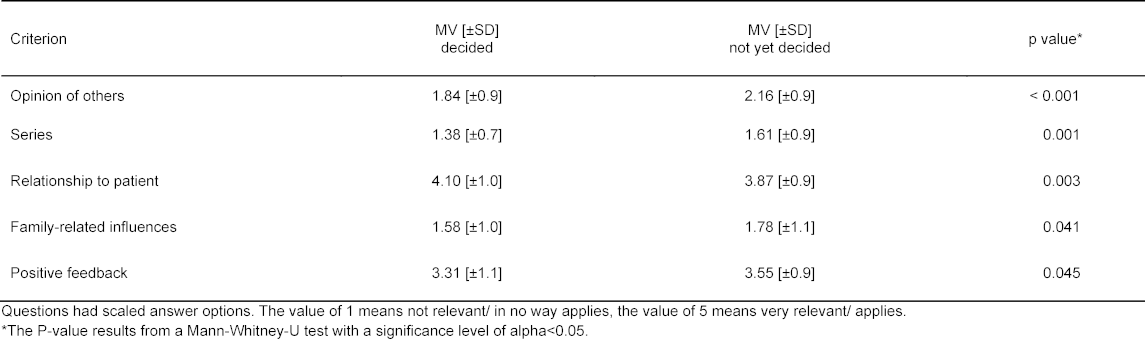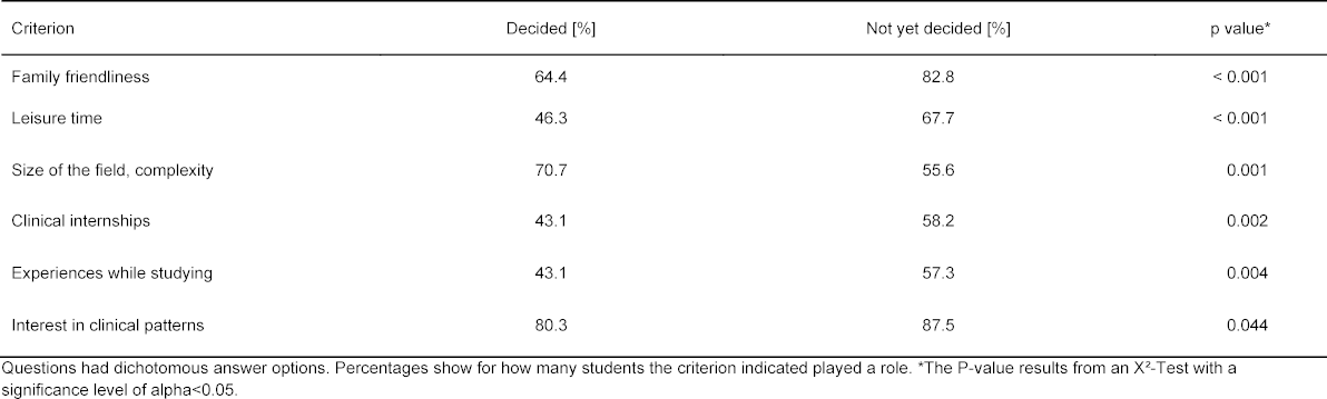 In order to examine whether different criteria play a role in specialty selection for those students who have already decided and those still undecided, X2-Tests were conducted for questions with dichotomous answer options and Mann-Whitney U Tests for questions with scaled answer options. The results of these two tests are presented in table 2 [Tab. 2] and table 3 [Tab. 3] and examine the same questions, only that due to the different question types, different tests had to be applied. Both tables present significant differences between those students who have already decided and those still undecided with regard to the criteria relevant for them for specialty selection. Table 2 [Tab. 2] shows that for different students the size and complexity of the field for the specialty selection was decisive, whereby for those still undecided aspects like family friendliness and leisure time were paramount for a later choice. Table 3 [Tab. 3] shows further that for those undecided, the esteem of others as well as TV series were significantly more relevant criteria for their later specialty selection as for those who had already made their decision for a specific field. In contrast those who had already decided on their field, the opportunity to build patient relationships was a significant relevant decision criterion. For the sake of completeness table 3 [Tab. 3] lists the criteria “family influences” and “positive feedback” however, the p value indicates subordinate roles. It was also to be seen that students who were still undecided considered more criteria as important on the whole as those who had already decided on their specialty.