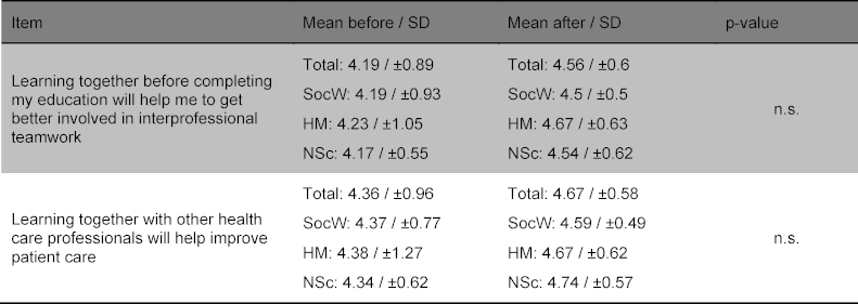 Table 4: Non-significant items regarding interprofessional learning (“1=does not apply at all/do not agree at all” to “5=applies/agree completely”).