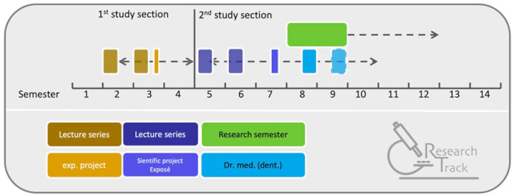 Figure 2: Curriculum of the Research Track (RT). The RT consists in both study stages of a lecture series, which is offered over two semesters. The RT in the 1st study stage includes a mandatory experimental practical internship, which can be accredited as Scientific Project I. In the 2nd stage of studies, the RT should lead to a medical doctoral thesis, whereby the project outline for the doctoral thesis can be accredited as Scientific Project II. In both stages, the students will be actively motivated to take a research semester off for their doctoral thesis and will be informed about the existing funding possibilities within the framework of Köln Fortune and other scholarship providers.