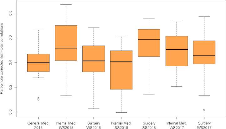 Figure 3: Distribution of corrected item-total correlations rit at the stations of the formative OSCE General Medicine 2018 and the summative OSCEs Internal Medicine and Surgery winter semester 2017/18 to winter semester 2018/2019.