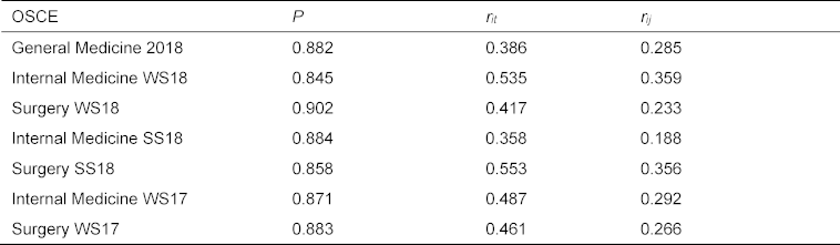 Difficulty P and corrected selectivities rit (correlations of the number of points achieved at one station with the points achieved at all other stations) as well as the mean inter-correlations with all other stations rij (mean inter-item correlation) were determined for the stations of all mentioned OSCEs. The product-moment correlation (according to Pearson, two-tailed P value) was used throughout as a correlation measure.