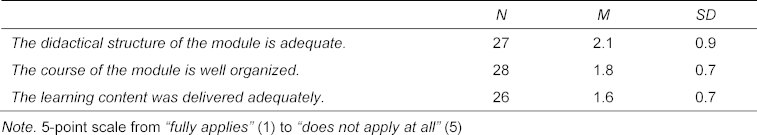 The piloting of the teaching module was evaluated by 29 students (16 nursing, 13 medicine). The evaluation results indicate a high acceptance of the module procedure and the didactical structure (see table 1 [Tab. 1]). The teaching module thus offers the opportunity of interprofessional sensitization for the use of digital technologies in the professional context.