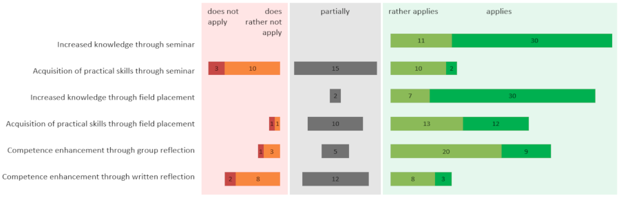 All students who attended the last seminar session of each semester took part in the evaluation. The response rate was 55%, which can be largely explained because the number of participants was typically reduced in this last session due to ongoing exams in other courses. Our evaluation primarily served to improve the course; in order to increase the scientific significance of the results, further adjustments would be necessary. For example, student competence acquisition can also be observed during thematic discussions in break-out groups and within the final written report. After appropriate operationalisation both could be profitably included in the evaluation (cf. e.g. in [22]). At the end of the semester student questions (see attachment 1 [Att. 1]) were collectively compared with the content of the curriculum. We have access to written self-assessments in the evaluation and the final reports, which capture acquired (see, for example, attachment 5 [Att. 5]) or lacking skills and knowledge (according to point 3 of the field report, attachment 3 [Att. 3]) in different competence dimensions. In the future, this qualitative data collected before and after the course could be matched at the level of individual students. We could also develop a long term pre-post evaluation (cf. [59]) with standardised evaluation instruments. This would increase the comparability over time and with other studies. To this end, we could aim at a pseudonymisation of the evaluation-survey, since our anonymisation – without any socio-demographic data collection – reduces analytical possibilities beyond mere description.