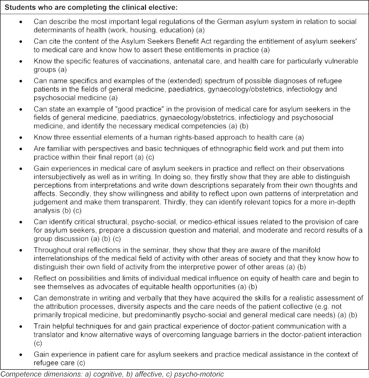 In order to become competent professionals in this field, prospective doctors need basic medical and communicative knowledge to cope with the everyday tasks of refugee care. In addition, they should learn to approach each patient in an open and curious manner, in order to find out about and understand the meaning and impact of socio-cultural belonging structures for the individual patient and for their understanding of the disease and its treatment [32], [60] without discriminating in professional practice according to ascribed characteristics (cf. [61]) regarding, for example, religion, ethnicity, nationality or social position (cf. Declaration of Geneva [62]).