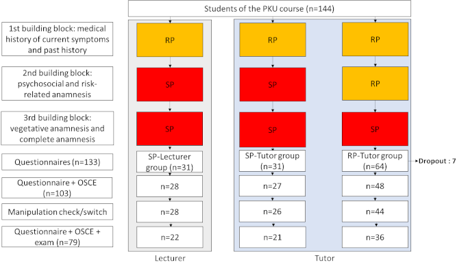 Figure 1: Flowchart of the study (Course of study. (SP = simulated patient, RP = role-playing with fellow students From left to right: SP-Lecturer, SP-Tutor, RP-Tutor group))