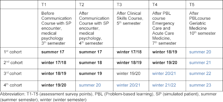The implementation of the curriculum is continuously evaluated. Students answer mainly paper-based questions (to increase the return rate). Questionnaires are distributed via EvaSys® (Evasys GmbH, 2017-2019, Lüneburg). The first cohort will have completed the curriculum by the end of summer term 2020. Students are all asked to take part in five questionnaire-based assessments over time (T1-T5). Data have been collected up to the 4th cohort (see figure 4 [Fig. 4]).