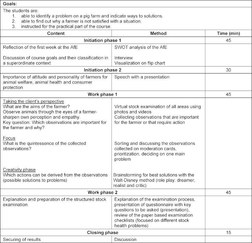 Methodology: Animal observation is trained using a virtual tour of a stock farm based on pictures and videos. The didactic approaches Design Thinking and the creative Walt Disney method are used in order to work on a previously prioritized problem. A typical conflict situation in pig farming is simulated in a role-play. Acquired skills are put into practice during a stock examination on the practice day, where the students communicate their observations. Evaluation is conducted using paper-based questionnaires and feedback interviews.