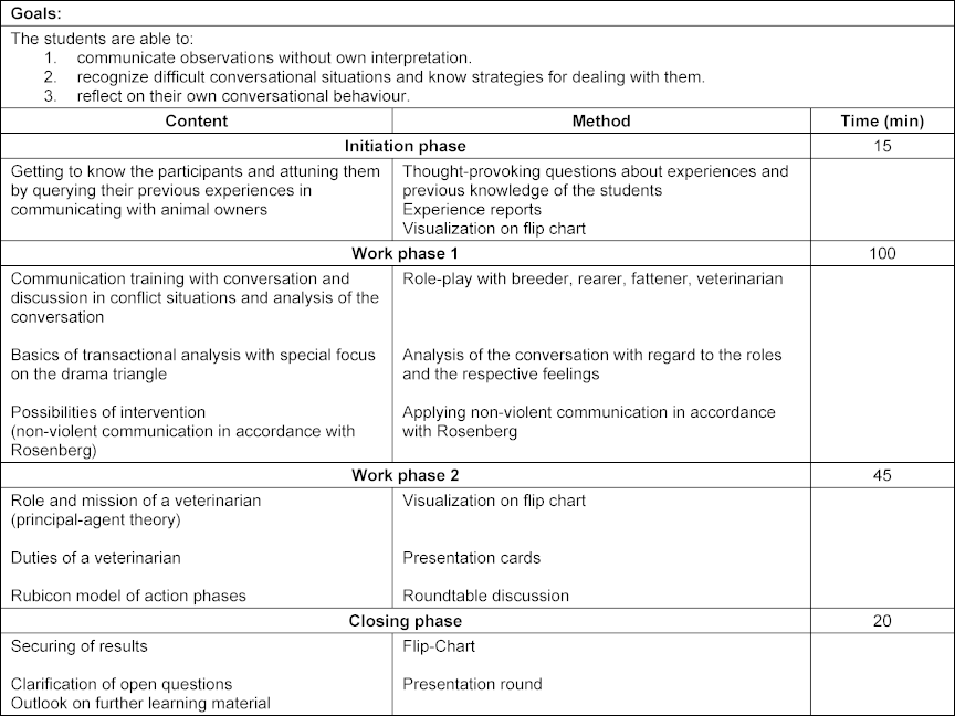 Students of veterinary medicine focussing on farm animals are confronted with increasingly difficult working conditions in their future field of activity. Hardly any other economic sector experiences a similar area of conflict between animal protection, environmental protection, consumer protection and the economy as livestock farming in Germany. The present goal of livestock management is to maintain a high state of health and welfare of the animals, especially with regard to preventive consumer protection. Compliance with standards has to be ensured as well as prevention of outbreaks of diseases and early detection of illnesses. The veterinarians’ task is to prevent health problems on farms and to minimize their effects by means of appropriate diagnostics and therapy. With their expertise on diseases, infections, animal welfare and food hygiene, veterinarians can act as a link between contrasting realities of consumers and those working in agriculture. For their role as “mediators between the worlds”, they must be trained accordingly. It is not sufficient to teach only veterinary knowledge during the course of studies; empathy and basic communication skills must also be enhanced. Currently, the curriculum of veterinary medicine in Germany does not include any obligatory courses on communication, although the effectiveness of consultations depends on an appreciative communicative exchange between the person keeping the animals and the veterinarian [6], [16], [18]. Contents are offered in the “hidden curriculum” or in elective courses [17], these being mostly aimed at communication regarding small animal or equine practice. In livestock medicine, there are completely different conflicting goals. A large number of different stakeholders are involved in the area of conflicts on farms (including controlling authorities, slaughterhouses, meat marketing industry, banks, air conditioning, construction and stable technicians, producer groups, end consumers). Another major difference is that observation of a whole herd with a variable number of animals rather than one individual animal has to be taken into account when communicating with the animal keeper. According to research findings, the described course focussing on communication during a stock visit is the first of its kind in Germany for the livestock sector, which must be offered as an educational training.