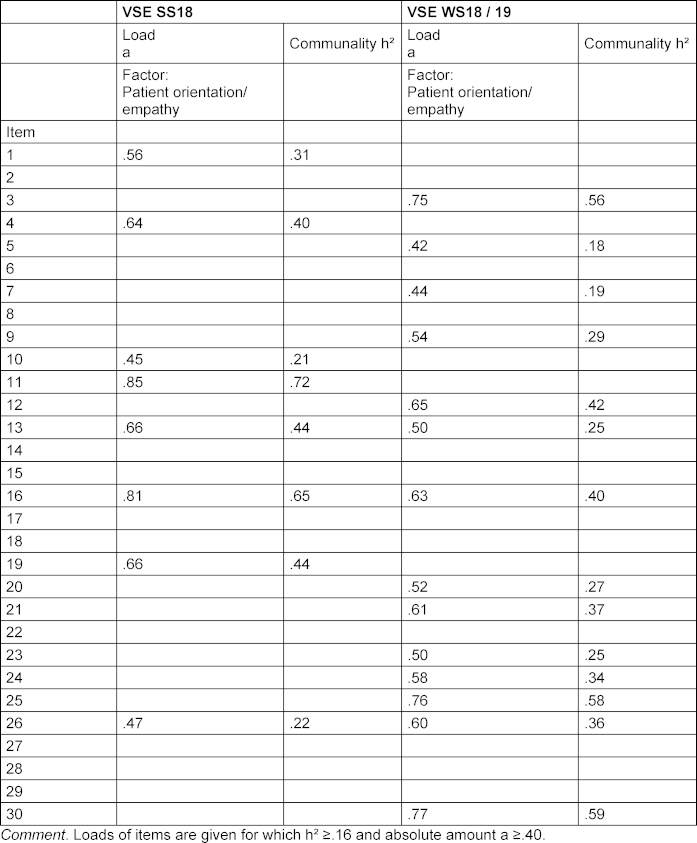 The criteria of Rost and Schermer were used to extract the number of relevant factors [31]. In the SS 18 group, 13 eigenvalues were greater than 1, whereas only one factor appeared to be plausible based on the scree plot. Only variables that had a communality of h²≥.16 and for which the absolute value was a≥.40 were represented by this factor (see table 3 [Tab. 3]). The remaining 8 items are difficult to represent accurately with a single factor. However, prioritising content plausibility over mathematical solution, merging 5 items (item 4, 11, 13, 16, 19) results in a significantly more appropriate content alignment under consideration of "patient-oriented, empathetic action and understanding based on the patient's situation and the content of the conversation" (Cronbach's α=.62, N=226). In the WS 18/19 group, 12 eigenvalues greater than 1 also resulted in only one factor based on the scree plot, whereas 14 items remained after applying the criteria. Here, 10 of the 14 items were also assigned to the aforementioned topic (3, 5, 7, 9, 12, 23, 24, 25, 26, 30; Cronbach's α=.60, N=193). Four further items show overlaps in content with the topic, but also with other topics, so that they could not be clearly assigned to the factor. Overall, it should be noted that the allocations and separations are not fully and finally accurate when considering the content of all items. Of the 5 items from the SS 18 group, 4 items were loaded again on the factor in the WS 18/19 group (items 23-26 WS 18/19).