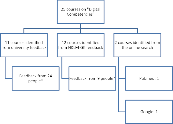 Figure 1: Distribution of research results for the overview "Digital Competences" in medical schools 2020 (*= One person was able to report back on several courses, NKLM-GK group = "Digital Competences" working group of the further development process for the National Catalogue of Learning Goals for Medicine and the subject catalogues of medical studies)
