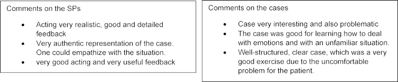 The SPs’ feedback at the beginning of the training made it clear that they had to get used to the new “expert role”, i.e. to using the evaluation criteria; questions were clarified in the evening feedback sessions with the program managers and SP trainers. In the end, the feedback from the SPs on the use of the feedback criteria and on their own role and function was markedly positive. They particularly praised the intimacy of the one-on-one encounter, which made it easier for them to give personal feedback. In Basel in particular, it was emphasized that the students were much more open than in previous years, they actively requested detailed feedback and thanked them for it explicitly. The change in the role at the beginning of the encounter, from the “organizer”, who asks the student whether they had read the information, to ‘the patient’, was never considered to be a problem.