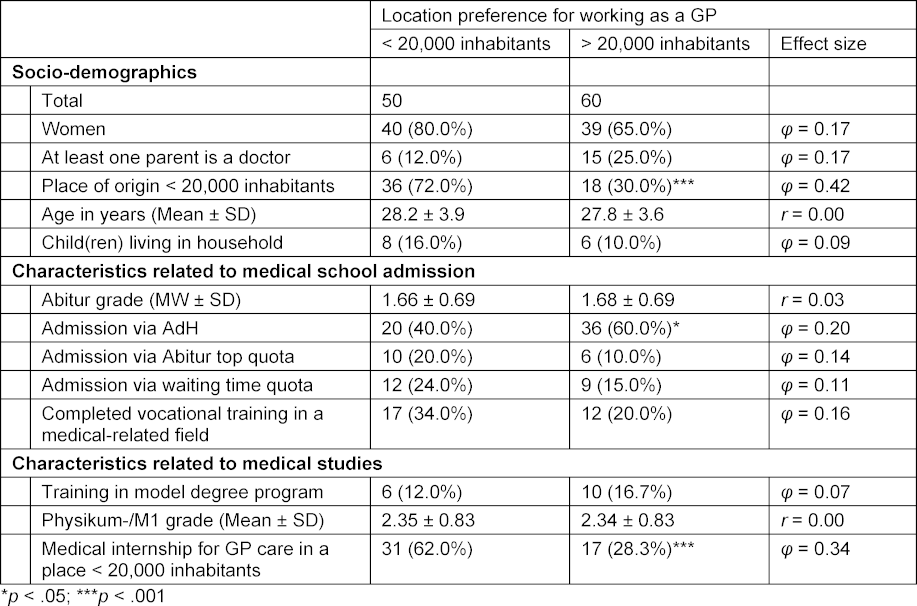 The comparison between those interested in working as a GP and those not interested shows that those with an interest were disproportionately likely to have been admitted to university via the waiting time quota (Χ2(1)=8.873; p<.01; φ=0.10). According to Cohen [23], this is a weak effect. Furthermore, these students more often than their fellow students who were not interested in working as a GP had already completed vocational training in a medical-related field, e.g. in health care and nursing or paramedicine (Χ2(1)=10.239; p=.001; φ=0.10). Here, too, a weak effect can be observed. Moreover, significant differences emerged with regard to age (U=51,167.5; p<.05; r=0.08) and location of medical internship for GP care (Χ2(1)=4.870; p<.05; φ=0.07), both with very low effect sizes. The group of students interested in working as GPs was further investigated in the following and considered in a differentiated manner with regard to location preference for the aspired career.