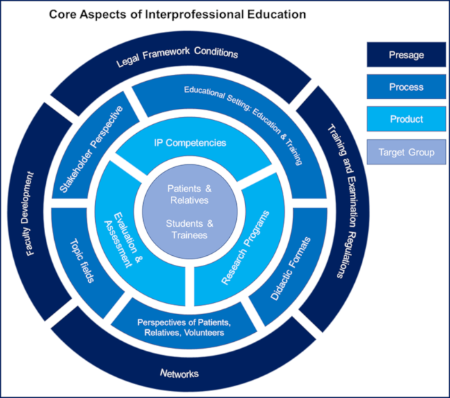 In the following, the essential core aspects for the future focus of IPE in the German-speaking countries are classified based on the 3P model by Freeth & Reeves [30] (see figure 1 [Fig. 1]). The focus of every IPE program is on the trainees/students and patients with their family members as the target group.