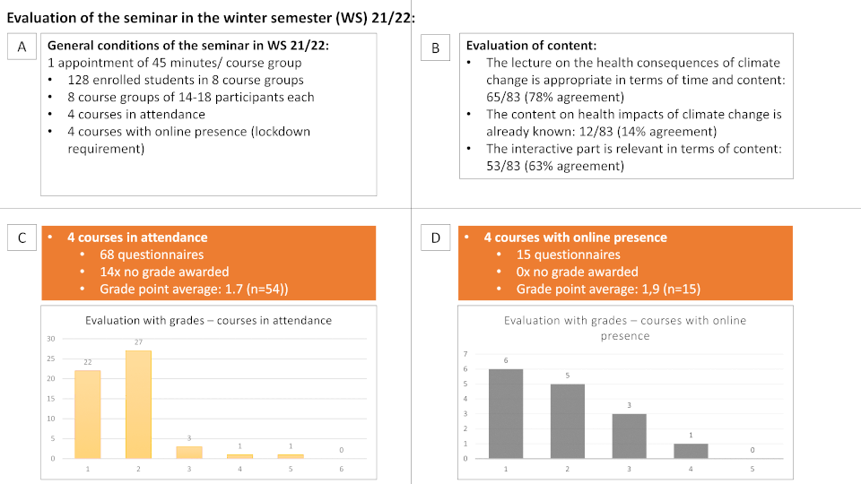 Figure 2: Presentation of the evaluation for the seminar: “pediatric environmental medicine” based on the evaluation of the students from the winter semester 2021/22. A: Summary of the general conditions of the seminar. B: Key statements on the content-related questions of the evaluation. C: Evaluation of the seminar with grades as a course with attendance (orange). D: Evaluation with grades for the seminar as a course with online-presence (grey). The grades are listed on the x-axis and the number of ratings on the y-axis. For each note, the number of notes in question is shown above the bar.