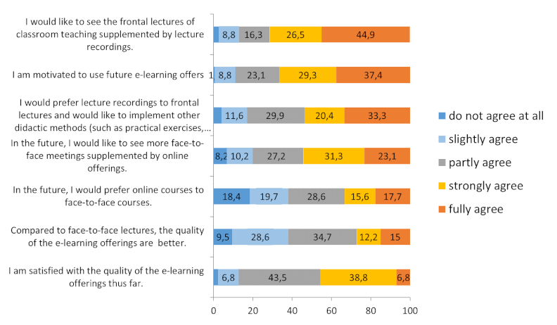 When concrete wishes and needs were mentioned, the offer to flank frontal lectures with digital media met with majority approval (71%). In this context, there was a demand to partially replace frontal lectures with recorded lectures to use the free attendance time for practical exercises (53.7%). About 67 percent of the students are motivated to use future e-learning offers, about 54 percent would strongly prefer more face-to face-meeting supplemented by online offerings and approximately 33 percent prefer online courses to face-to face courses. About 46 percent of the students are rather satisfied with the quality of the e-learning offerings and about 27 percent report, that the quality of e-learning offering is much better, than die quality of face-to face-lectures (see figure 5 [Fig. 5]).