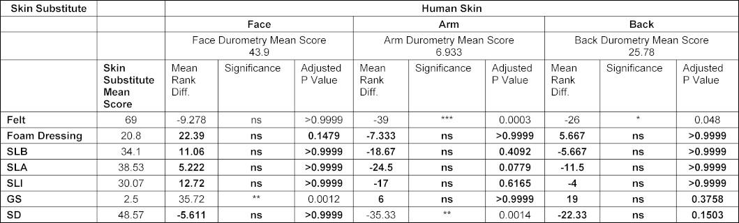 Table 3: Comparson of Durometry Outcomes of Skin Pads vs Skin using Kruskal Wallis Test