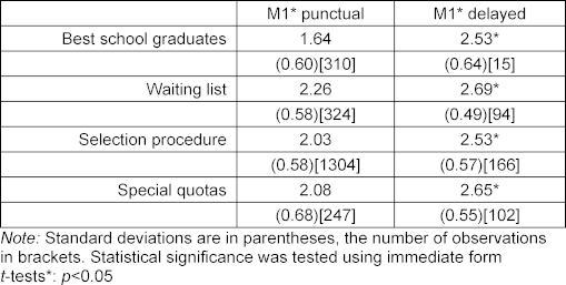 Table 4 [Tab. 4] shows that students who reach M1* late, demonstrate across all admissions groups significantly (t-test) poorer performance than those who reach it within the intended amount of time. In the subgroup of students with delays, we find no statistically significant differences between the four admission groups.