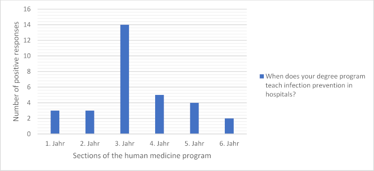 In view of the increasing demand for interprofessional training of healthcare professionals [43] in response to the growing importance of interprofessional healthcare [9], [10], [44], [45], we also attempted in our survey to focus on the two healthcare professions that assume central responsibility for infection prevention in hospitals: medicine and nursing. Due to the number and diversity of educational institutions for healthcare and nursing, it was not possible to determine how infection prevention is currently represented in healthcare and nursing training as part of this project. In order to at least contrast – rather than compare – the medical studies with a nursing training course, we attempted to include the survey on the training for a specialist nurse in hygiene and infection prevention. Due to the low response rate, this could only be summarized, is not representative and just a small insight into the subject. After completing the study, we have to conclude that the structure of medical studies and a training for a specialist nurse in hygiene and infection prevention are too different for a meaningful mapping of both courses in a joint survey. Despite these limitations, we have decided to present some results, as we believe that it is worth considering a common objective in an interdisciplinary and interprofessional subject such as infection prevention, even though it is also clear that hygiene specialists are less likely to be users of infection prevention in healthcare facilities later on. Their role will be more of an advisory and controlling nature, while medical staff are primarily among the professional groups that apply it. It would make sense to develop common learning objectives and interprofessional teaching formats for medical studies and generalist nursing training in order to strengthen the interprofessional concept of infection prevention in hospitals in the interests of patient safety right from the training stage.