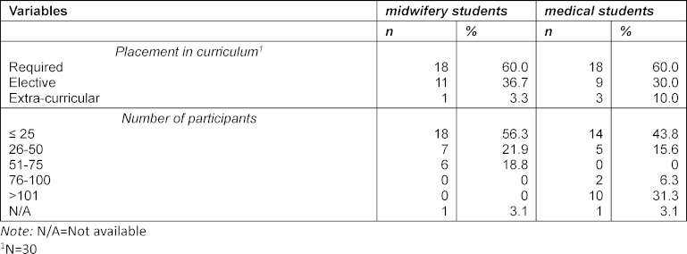 Participants were asked about the focus of their courses. Two categories occurred most in this multiple choice question: practical skill training (68.8%, n=22) and attitude formation (71.9%, n=23). In 18.8% (n=6) of courses, the focus was knowledge transfer. Furthermore, most courses were part of the required curriculum (60%, n=18) in both study programmes.