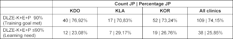Table 1: Frequencies (%) of JPs who, based on self-judgement, have mastered over 90% of the learning objectives at the specified competence level and thus achieved the training goal or have mastered below 90%, indicating a learning need for more than 10%of the learning objectives. Values are provided for each clinic (KDO, KLA, KOR) and overall.