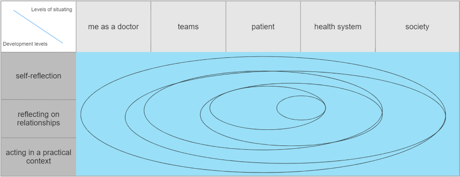 In our approach to professional identity development, students should consciously engage with the five situational levels of doctor, team, patient, healthcare system and society in order to develop responsible action and active relationship building. The selection of these five situational levels is based on the practical experience of the faculty involved and does not claim to be exhaustive.