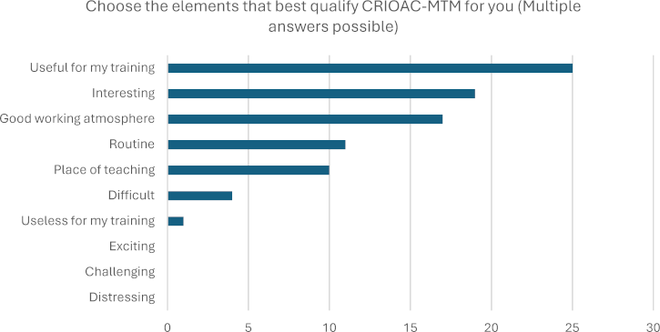 For acquired knowledge, residents were first asked if CRIOAC MTM has helped them acquire skills or knowledge useful for their daily practice. The results showed an overwhelmingly positive response, with 84% (27/32), while no negative responses were present. Secondly, they were asked if they think they have acquired knowledge about osteoarticular infections thanks to CRIOAC MTM, of which 84% (27/32) answered positively. Then the orthopedic residents were provided with seven items and asked to choose as many as applicable in terms of their perceived benefits. Responses were pooled, and each item was ranked based on the most chosen out of all total responses. Among the completed responses, the highest rank was given to “knowledge of the pathology treated by CRIOAC (complex osteoarticular infections): diagnosis and treatment,” selected by 78% (25/32) of the participants as demonstrated in figure 4 [Fig. 4]. When asked about the impact of MTM on their knowledge of the various specialties involved, 84% (27/32) of the respondents responded positively. Additionally, the majority, 78% (25/32) of the orthopedic residents, expressed that their participation in MTM would make it easier for them to access case presentations on osteoarticular infections, if necessary, in their future practice.