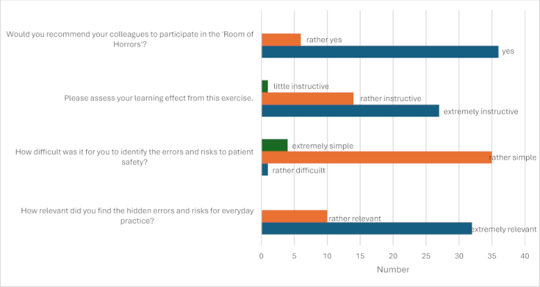 Teams identified more errors in the simulation rooms than originally placed. However, a differentiated detection rate was not recorded. Errors such as incorrect patient positioning, an open urinary catheter, and empty hand sanitizer were recognized by all participants. Missing isolation precautions for documented influenza infection were overlooked by nearly all groups. Evaluation forms indicated that all students found the simulation relevant and educational for professional practice and would recommend participation to peers (see figure 2 [Fig. 2]). Open-ended questions asked about significant experiences, suggestions, and ideas for future RoH designs. Students emphasized the high relevance of the format for professional practice and its effectiveness in raising awareness of risks in patient care. They also highlighted the importance of a constructive error culture as a learning opportunity. Additionally, students suggested incorporating RoH exercises throughout their studies to simulate increasingly complex situations. Realistic room design and smaller group sizes of fewer than four participants were recommended to optimize the RoH experience. Overall, students found the simulation engaging and enjoyable.