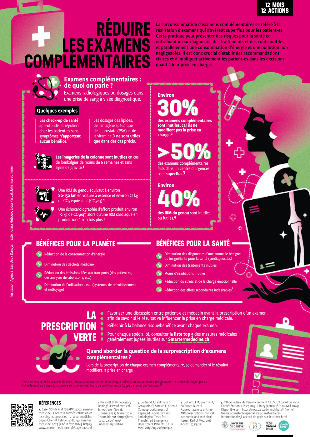 Since January 2024, the Revue Médicale Suisse (RMS), has supported an initiative to provide evidence-based “green prescriptions” on 12 themes that are beneficial for both the individual health of patients and the environment ([https://www.revmed.ch/infos-patients/calendrier-12-mois-12-actions-pour-l-environnement], retrieved 8th January 2025). Each month, a new action is proposed and presented on the RMS website and as a printed colourful poster included in the journal to be displayed in the medical practices. The posters have also been translated into German and Italian.